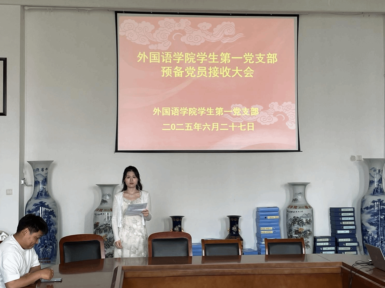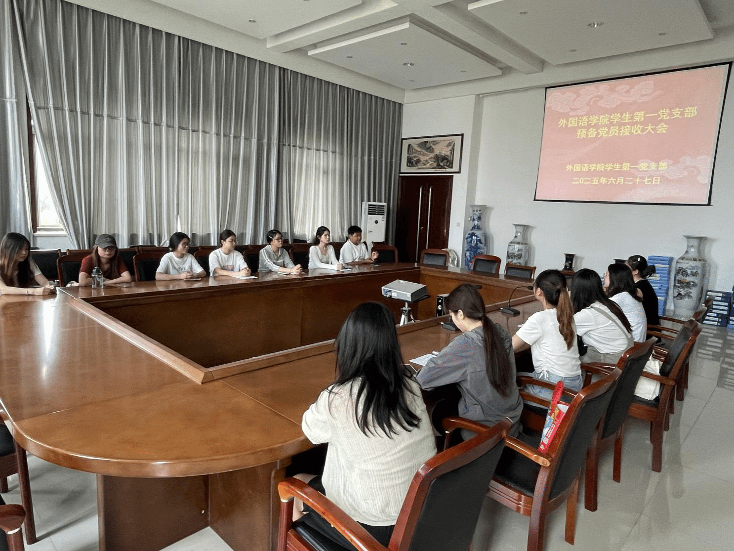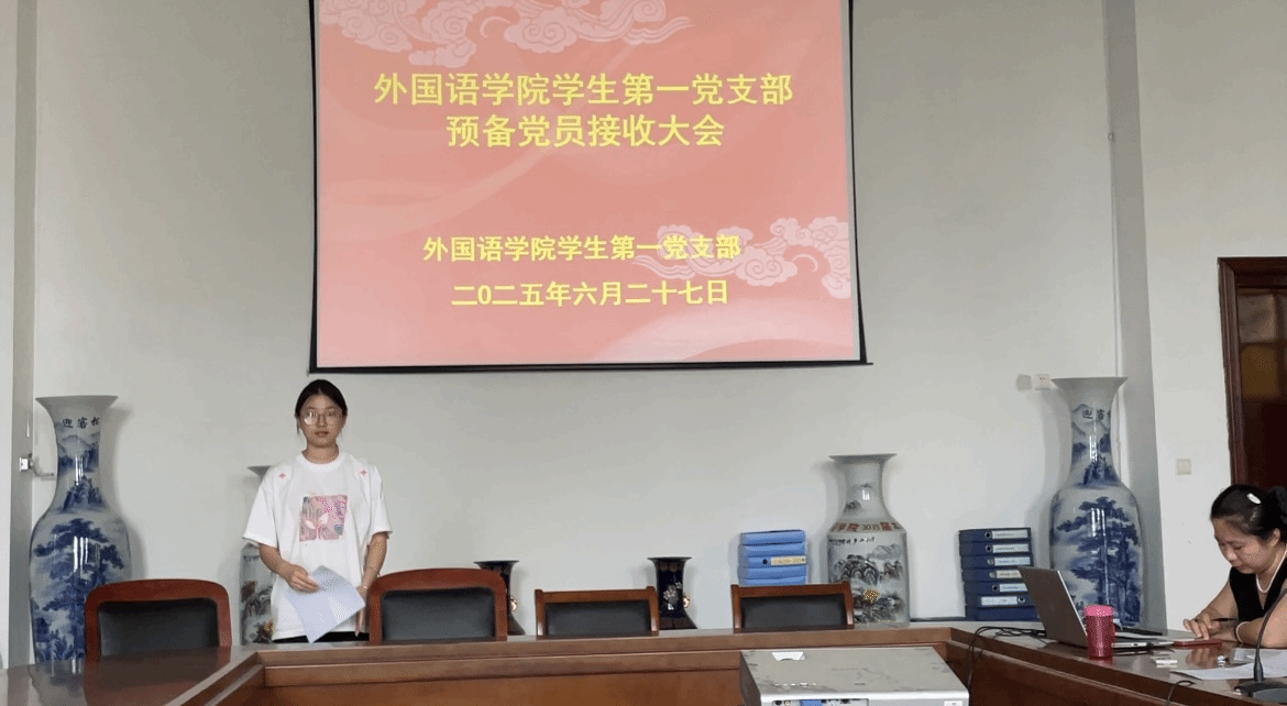 经学校党委批准,2025年6月27日下午,外国语学院学生第一党支部在文质楼B516召开了支部党员大会,讨论接收本支部上半年预备党员相关事宜,学生党支部师生党员及4位党员发展对象参加了会议。此次会议由学生第一党支部书记田方主持,本次会议应到正式党员13名,实到正式党员8名,应到预备党员8名,实到5名,符合开会规定。