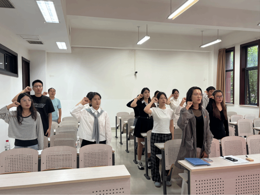 在最后的议程中,全体党员起立,面向党旗,庄严举起右拳,在组织委员唐延昕的带领下,重温入党誓词。铿锵誓言回荡会场,进一步强化了党员的身份意识和责任担当,提醒大家始终不忘入党初心、牢记职责使命。