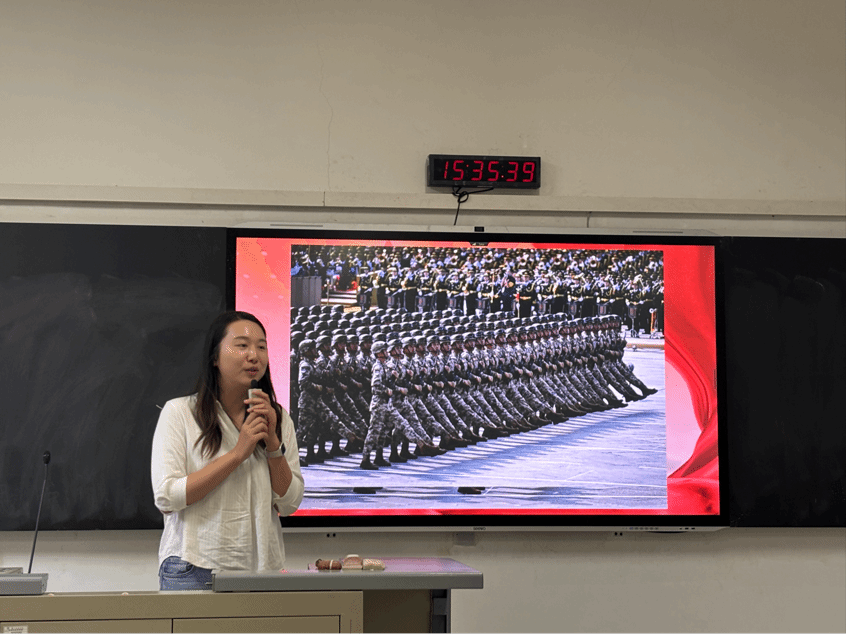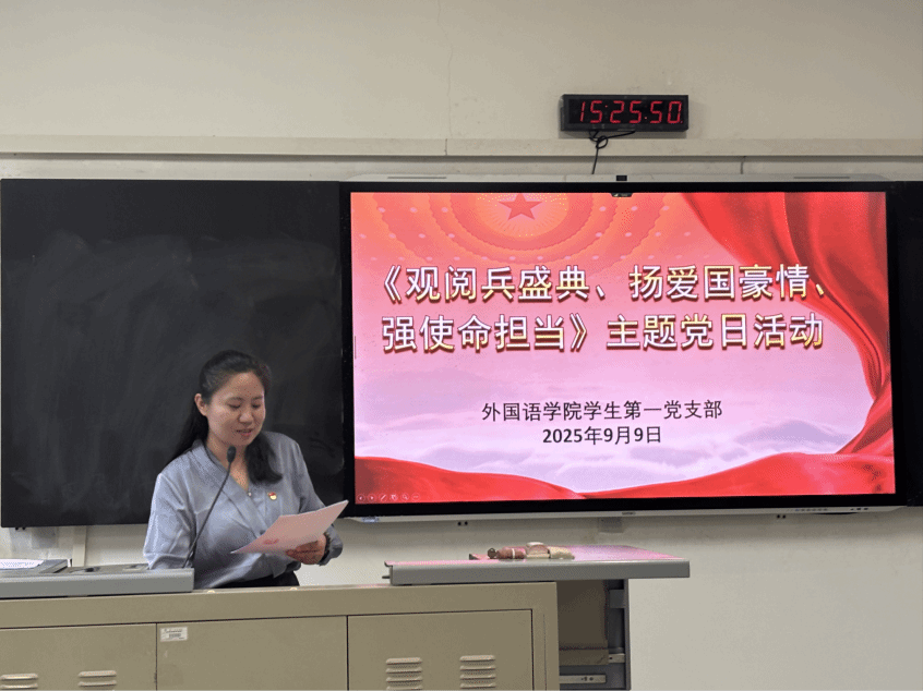 2025年9月9日下午,为深化爱国主义教育,强化党员使命意识,郑州师范学院外国语学院学生第一党支部开展了“观阅兵盛典、扬爱国豪情、强使命担当”主题党日活动,本次主题党日活动由支部书记田方主持。