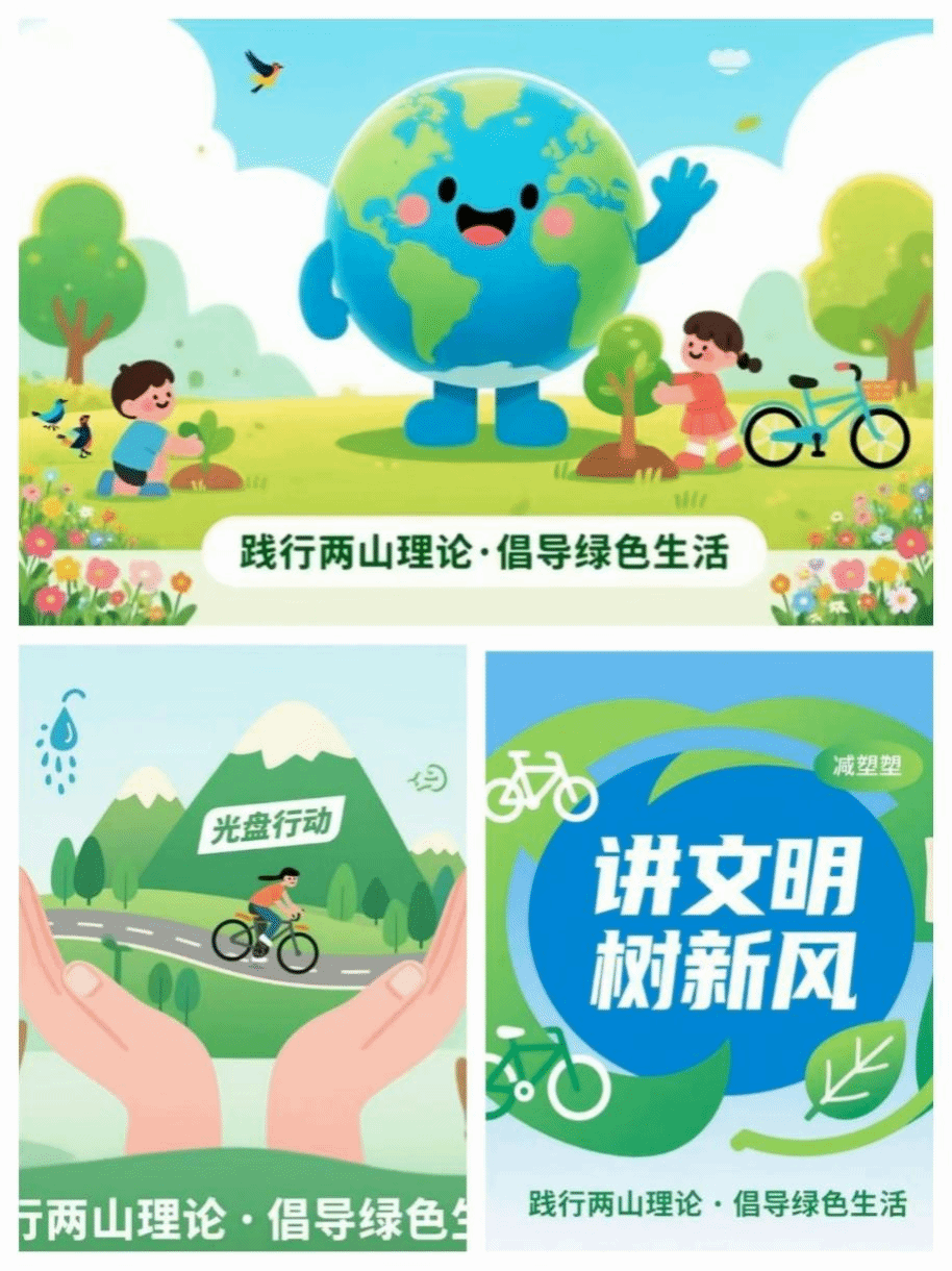 围绕“践行两山理论·倡导绿色生活”,借三张图展现环保行动:从光盘惜粮、节水节电分类,到骑行减塑低碳,再到植树护地球,以日常小事汇聚生态守护力,呼吁你我共筑绿色家园,让文明新风与青山绿水同辉,用行动书写人与自然和谐共生的美好篇章。