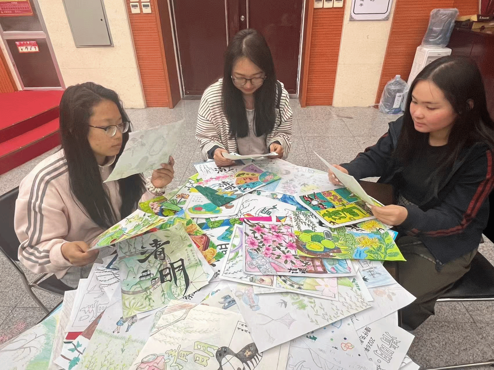 比赛启动后,全院同学积极响应、踊跃参与,大家纷纷拿起画笔,结合自身对清明文化的理解,从踏青、祭扫、插柳、吃青团等传统习俗,到缅怀革命先烈、感悟春日生机等主题入手精心构思创作,不仅将传统民俗元素与现代设计理念巧妙融合,让作品兼具文化性与创意性,还运用了多样的表现形式,如油画,版画和剪纸等,让每一幅作品都成为清明文化的鲜活表达。
