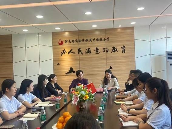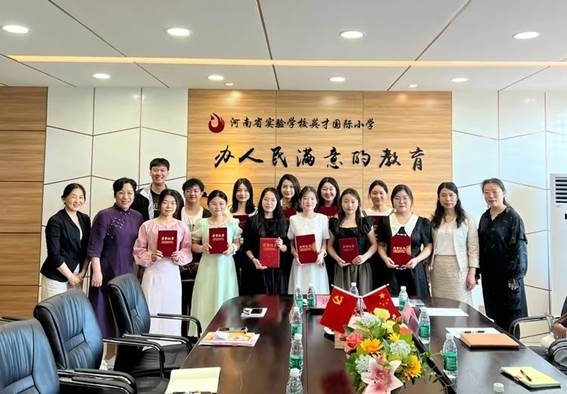 2024年5月10日,河南省实验学校英才国际小学为我院2024届英语专业实习生举行实习工作总结仪式。英才国际小学校长刘利梅、教导主任刘爱萍、外国语学院副院长耿霞、常金艳老师及指导老师代表和12名实习生参加。