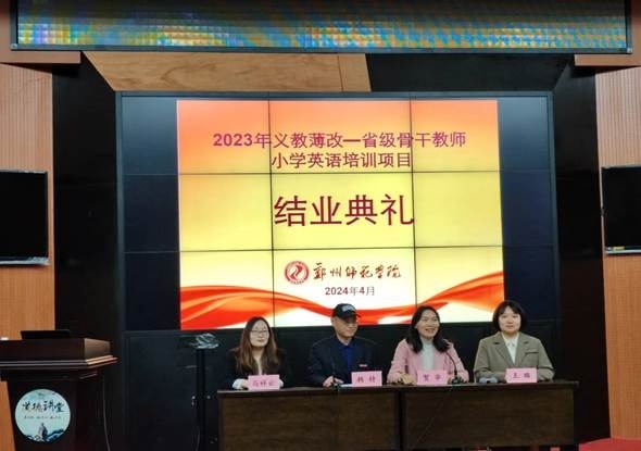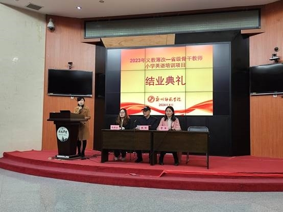 2024年4月3日上午,由郑州师范学院外国语学院承办的“2023年义教薄改—省级骨干小学英语教师培育项目”结业,学员们齐聚文质楼一楼报告厅参加结业典礼。外国语学院韩特副院长、马祥云老师、王璐老师出席结业典礼,仪式由外国语学院科研办公室主任贺华老师主持。