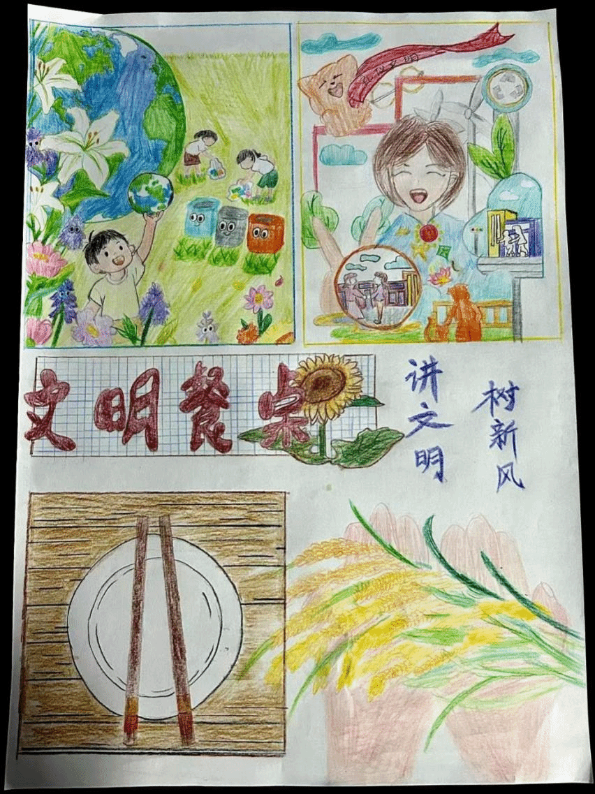 作品围绕 “讲文明树新风,创造高质量生活” 展开,以孩童视角串联场景:上方用垃圾分类、社区互助,展现生态保护与社会礼仪;“文明餐桌” 借餐具、稻穗,呼吁珍惜粮食。以童趣绘画融合环保、节约等文明行为,传递从日常践行文明,共创美好质量生活的理念。