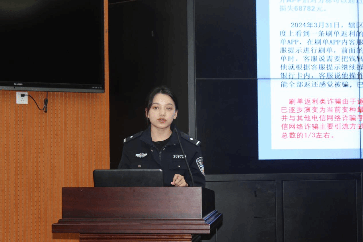 张警官从电信诈骗形式的演变展开讲解。她通过一组数据阐述了近几年来我校学生遭遇到的电信诈骗情况,指出大学生群体因社会经验少、信息甄别弱,成为骗子重点瞄准对象,其中大一新生、考研族、游戏爱好者是高发受害人群。