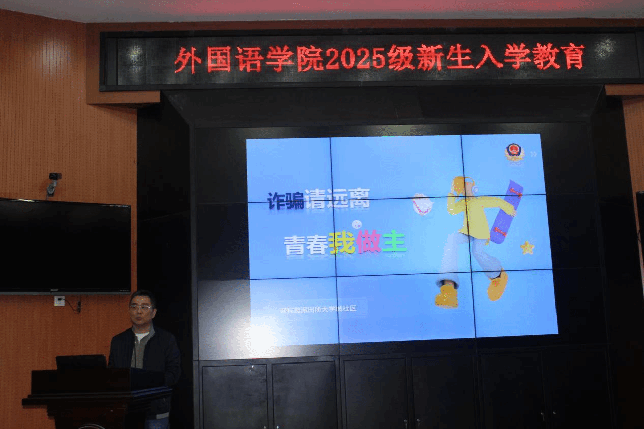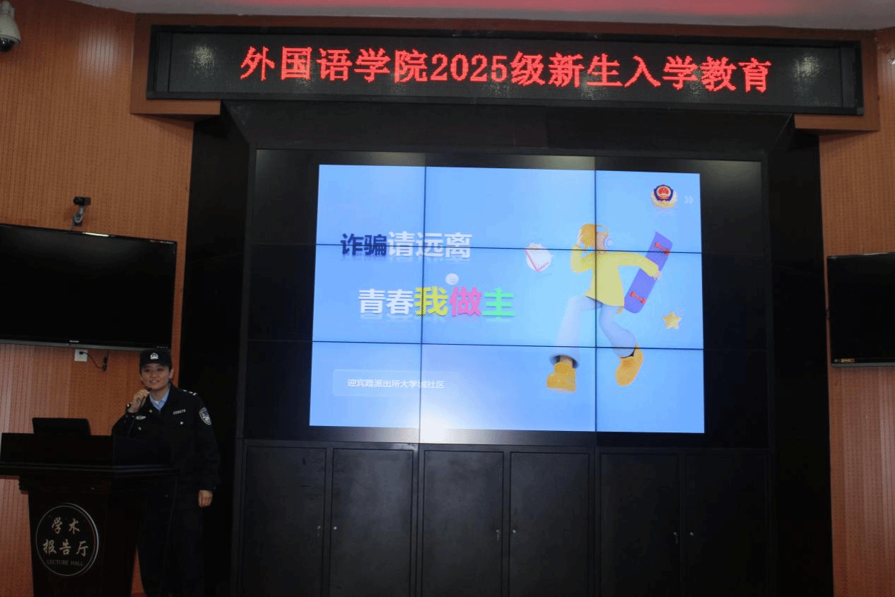 为切实提升外国语学院2025级新生的反诈意识,守护财产安全,共筑平安校园,9月23日我院联合迎宾路派出所开展了反诈专题教育活动。活动由外国语学院党支部副书记刘珂主持,派出所张警官、孙警官担任主讲嘉宾。