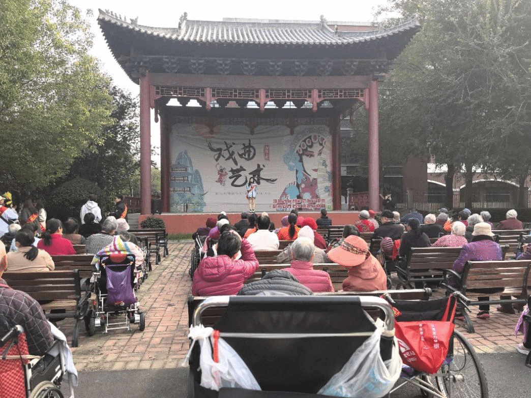 演出在极具地方特色的黄梅戏舞台中拉开帷幕,演唱者将传统唱腔与情感完美融合,演绎得绘声绘色,老人们听得入神,不时露出欣慰笑容。
