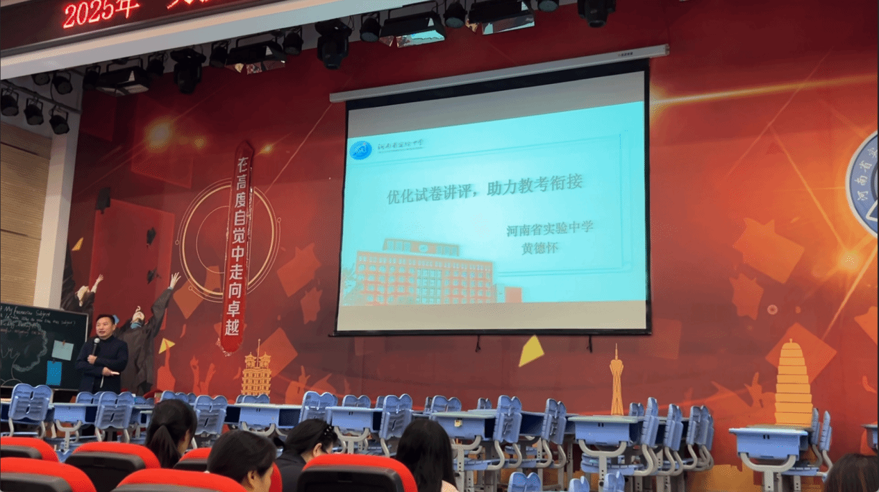 示范课结束后,河南省实验中学(英才校区)黄德怀校长带来《优化试卷讲评,助力教考衔接》专题讲座。黄校长结合多年教育教学管理经验,从试卷讲评的常见问题、优化策略、教考衔接关键点等方面展开分享,既有理论高度,又有实践案例,为同学们解答了教学实践中的困惑,提供了极具价值的指导。