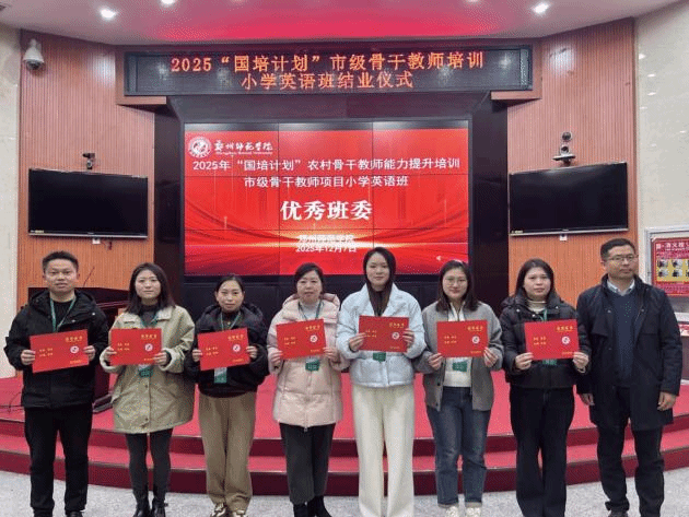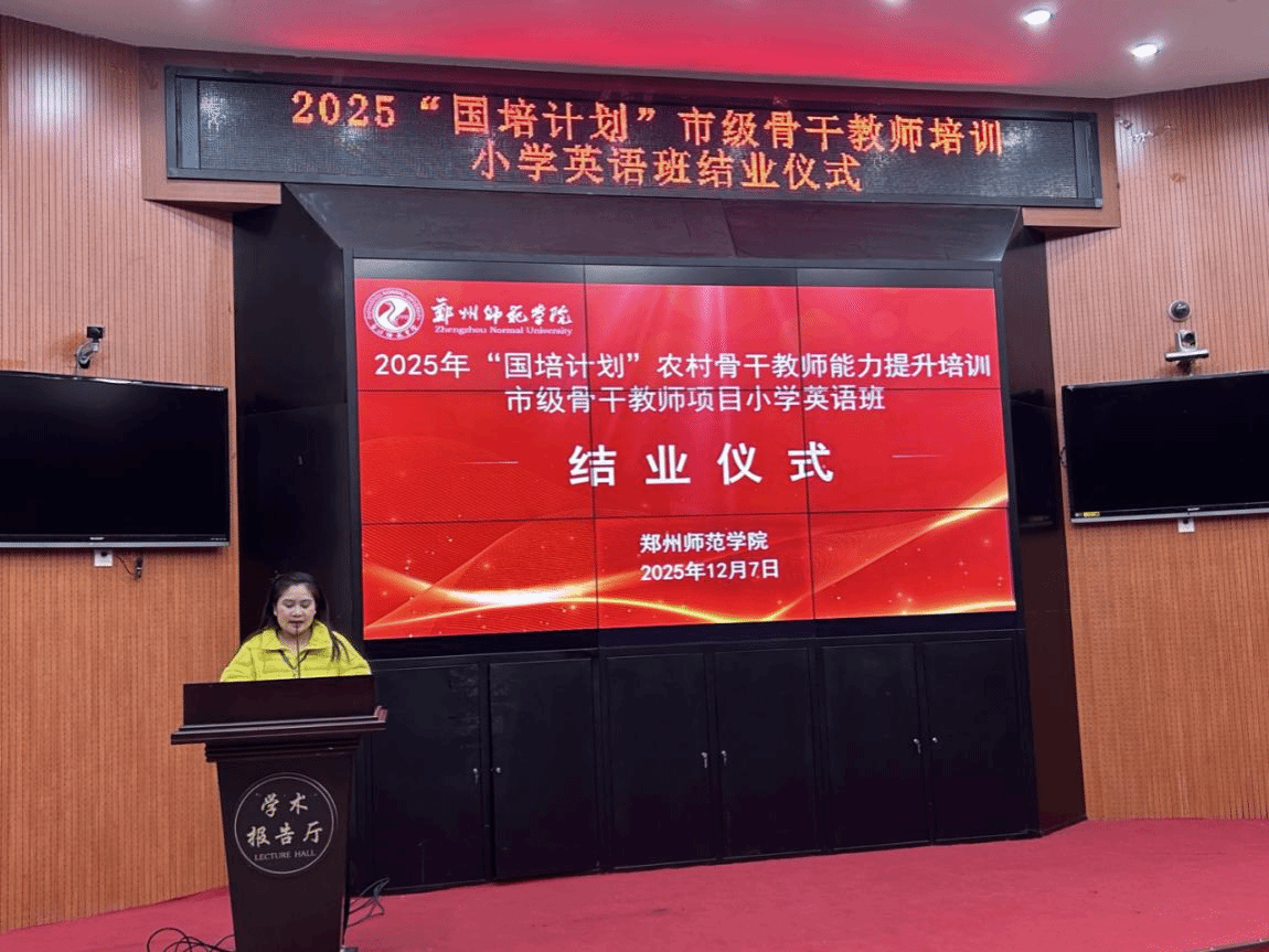 12月7日,2025年河南省“国培计划”农村骨干教师能力提升培训项目小学英语班结业典礼于郑州师范学院东校区文质搂A105举行。郑州师范学院外国语学院党总支书记赵海兰、英语系主任李占启,以及项目团队老师出席典礼。典礼由学员邓金金老师主持。