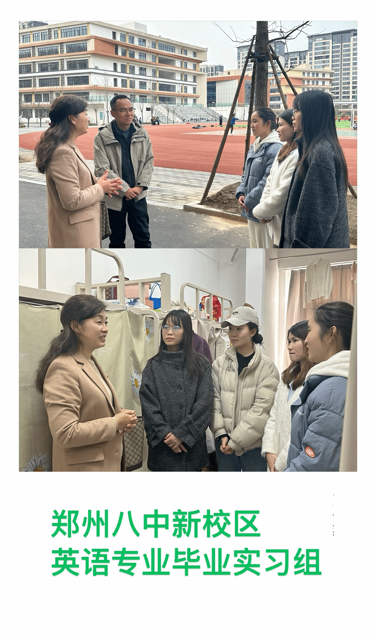 为保障实习工作顺利开展,3月16日上午,外国语学院副院长赵芳专程带队送实习生前往郑州八中新校区。抵达后,赵芳副院长实地参观了该校的教学楼、学生宿舍等场所,细致了解学生的学习生活环境与配套设施。