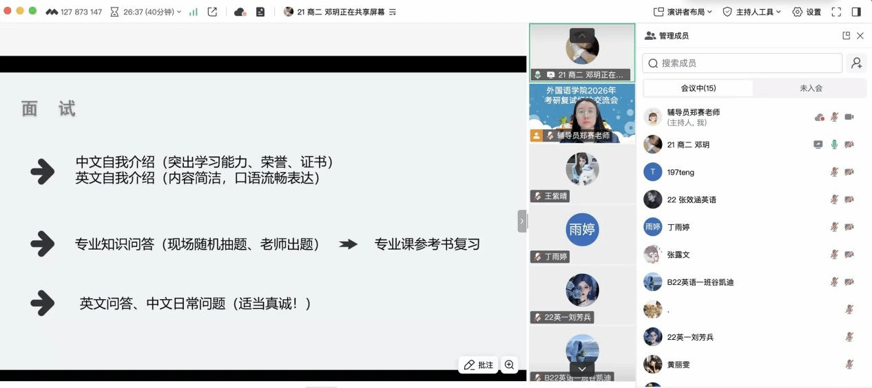 本次经验交流会干货满满、实用性强,有效缓解了同学们的备考焦虑,为大家顺利通过复试提供了有力支持。未来,我院将持续开展此类学业帮扶活动,助力更多学子实现升学目标,书写青春奋斗篇章。