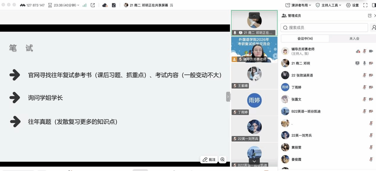 分享后同学们积极提问,学姐耐心解答,帮助大家理清备考思路、缓解焦虑,与会同学表示收获满满。